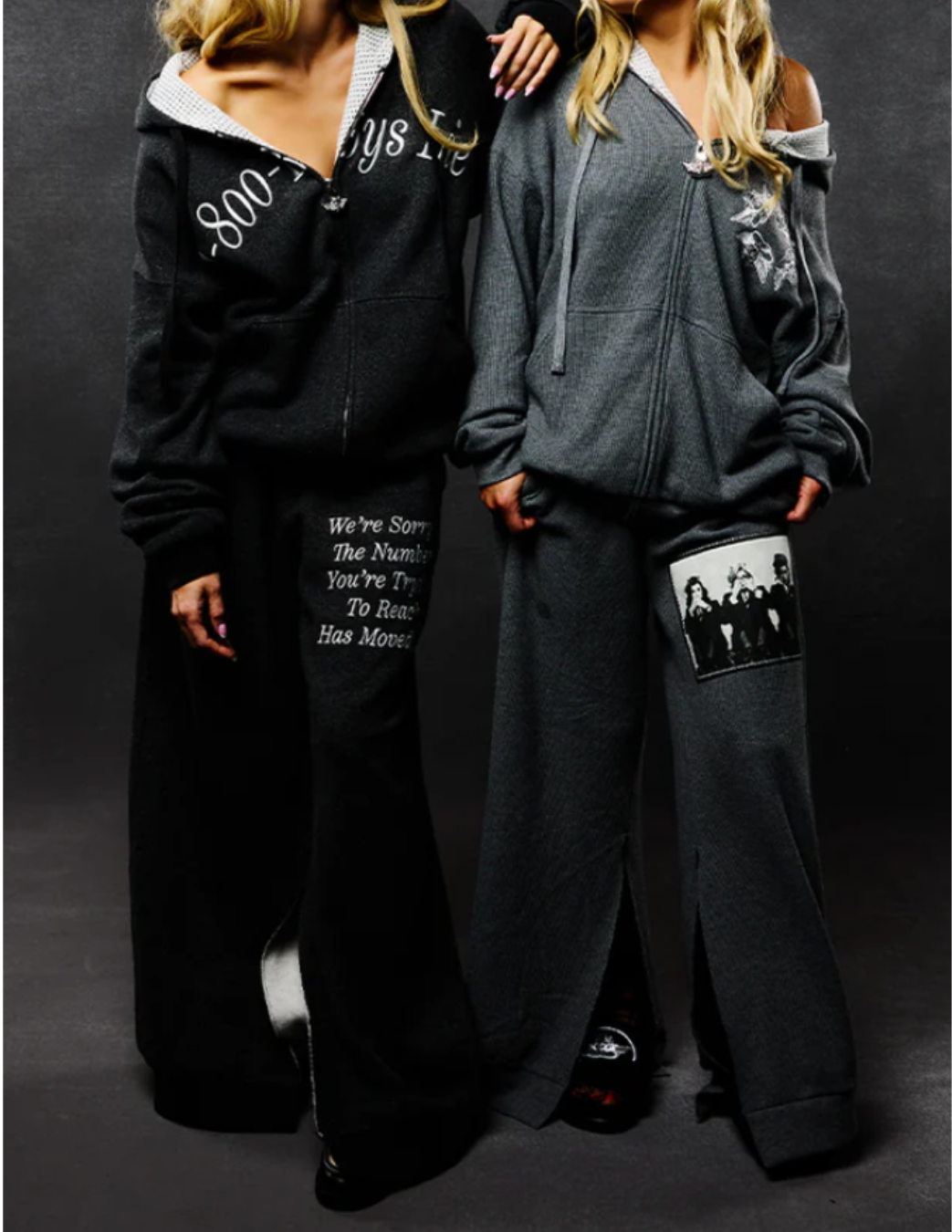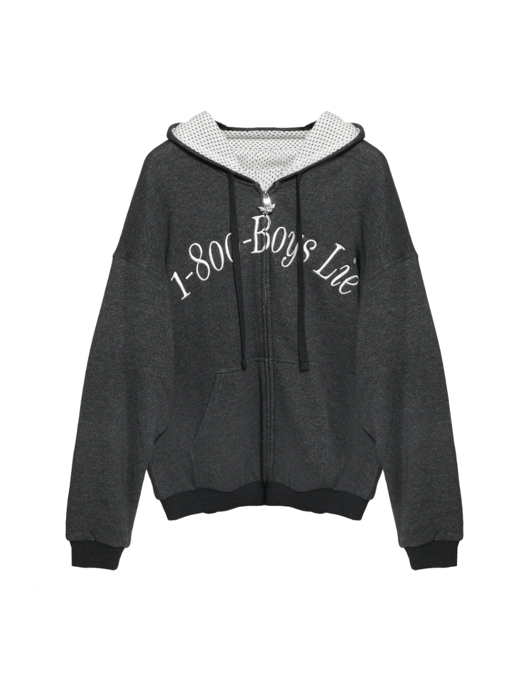 The dark grey zip-up is elevated with the "1-800 Boys Lie" graphic across the front, tied together with the phrase written on the back.