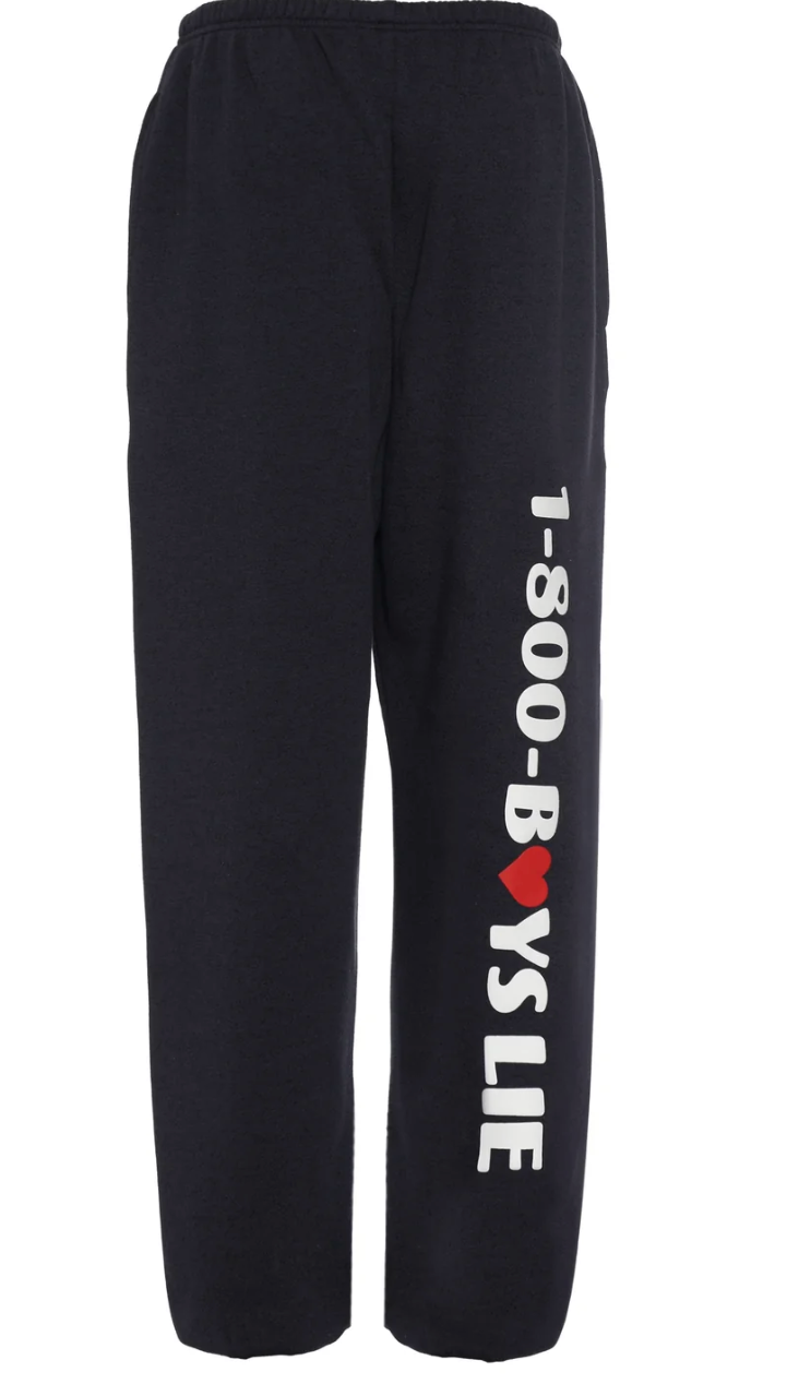 Featuring the bold "1-800-BOYS LIE" graphic down the leg, these sweatpants combine comfort and attitude. Made from soft, cozy fabric, they offer a relaxed fit that's perfect for lounging, running errands, or a casual day out.