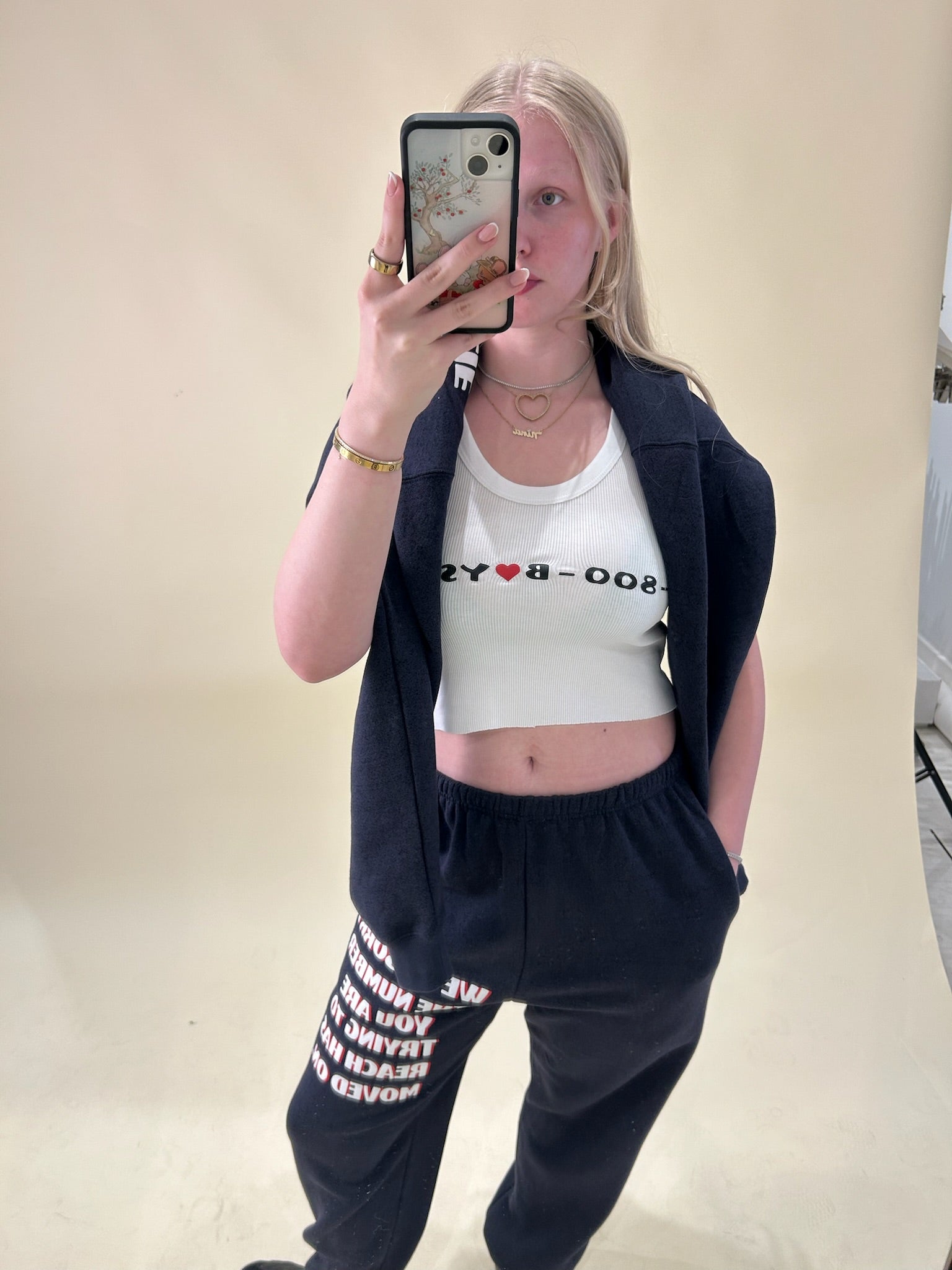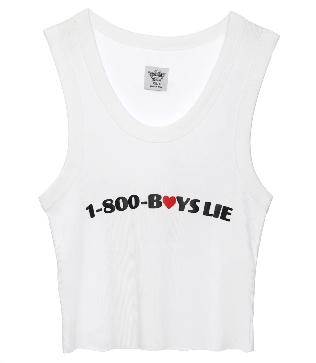 This sleek, white ribbed tank features the iconic "1-800-BOYS LIE" graphic on the chest, adding a playful and edgy touch to your look. The fitted design hugs your body for a flattering silhouette, while the soft ribbed fabric ensures a comfortable fit that moves with you.