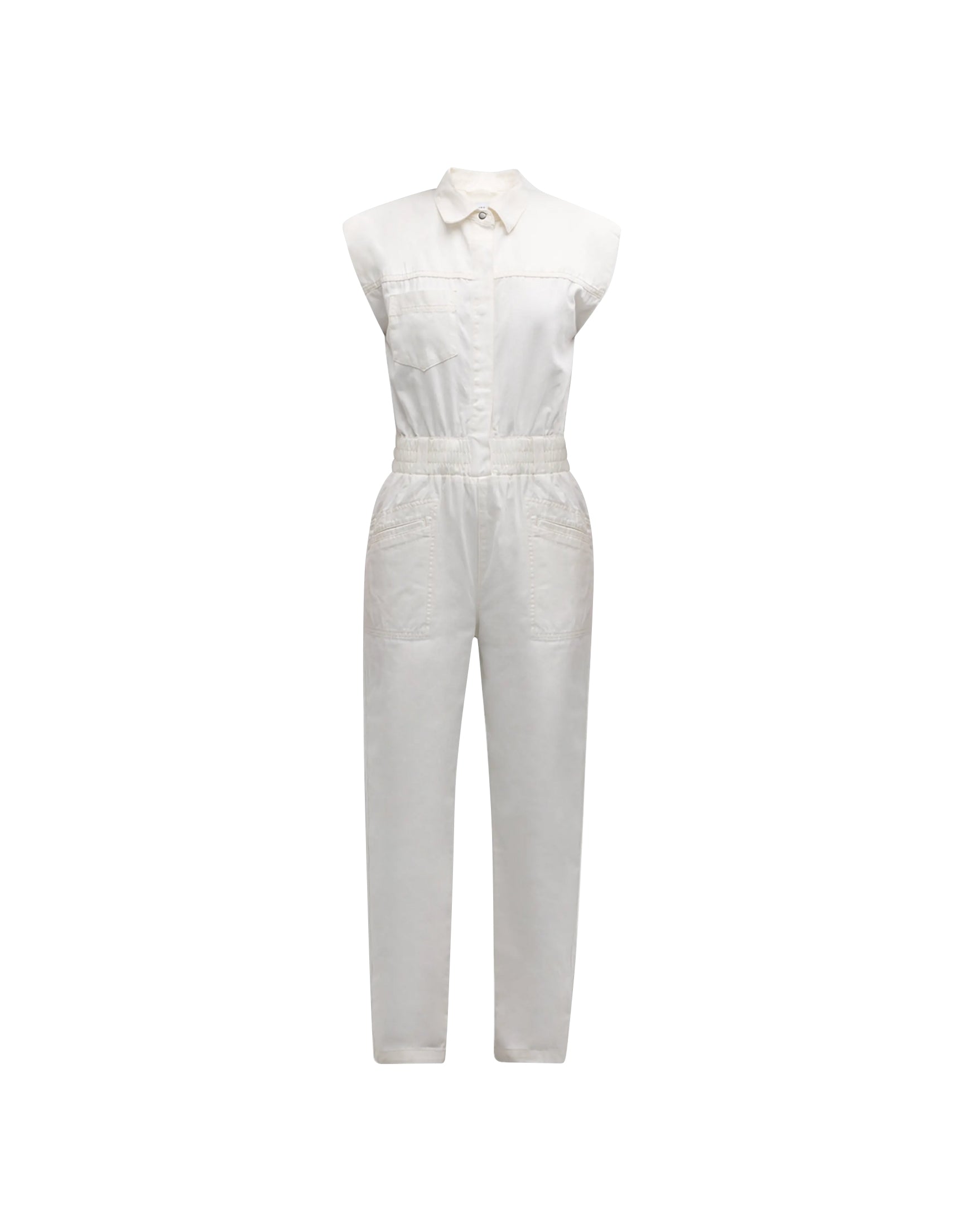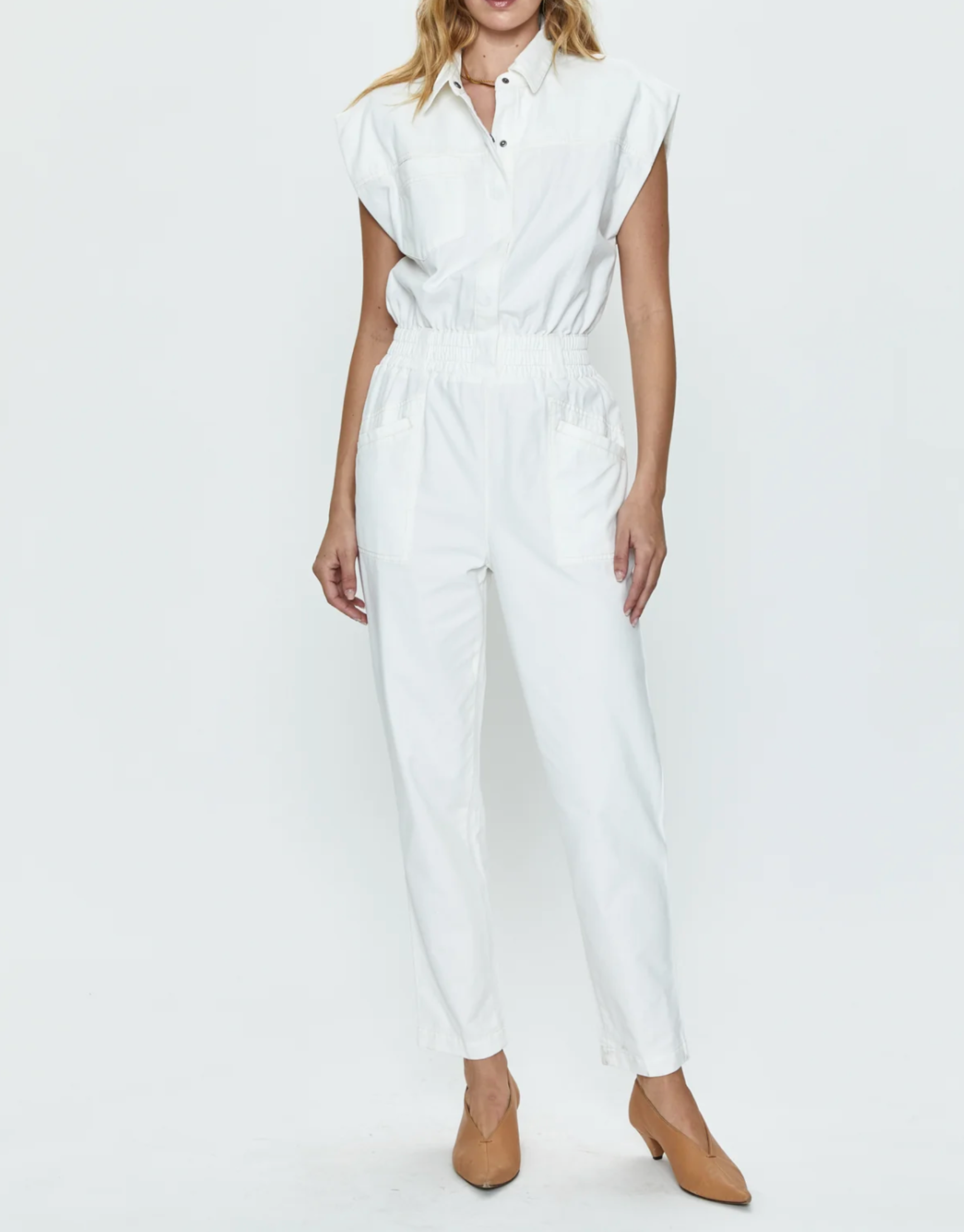 Feminine-forward jumpsuit silhouette featuring a cinching elastic waist, snap button front, and padded shoulders for powerful posturing that dresses up and down with ease.