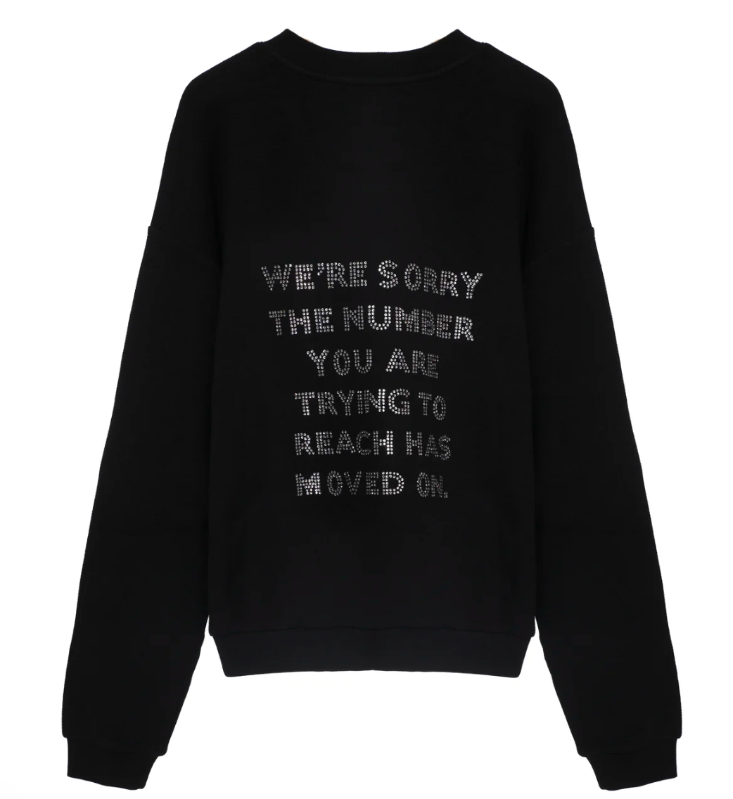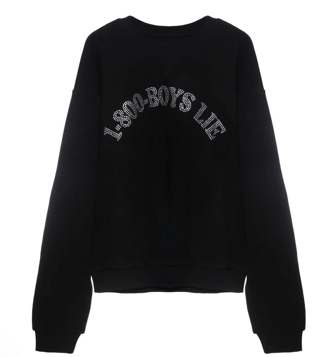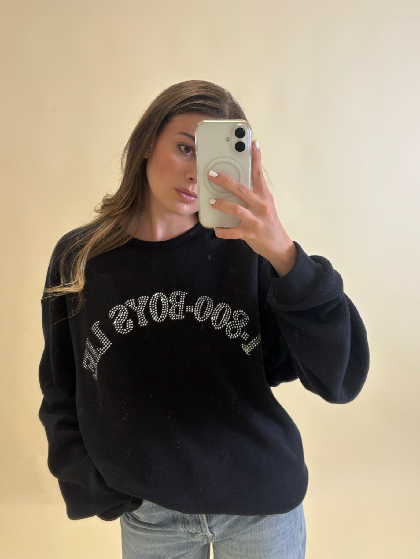 This oversized black crewneck sweatshirt featuring a rhinestoned design is the perfect mix of comfort and style.