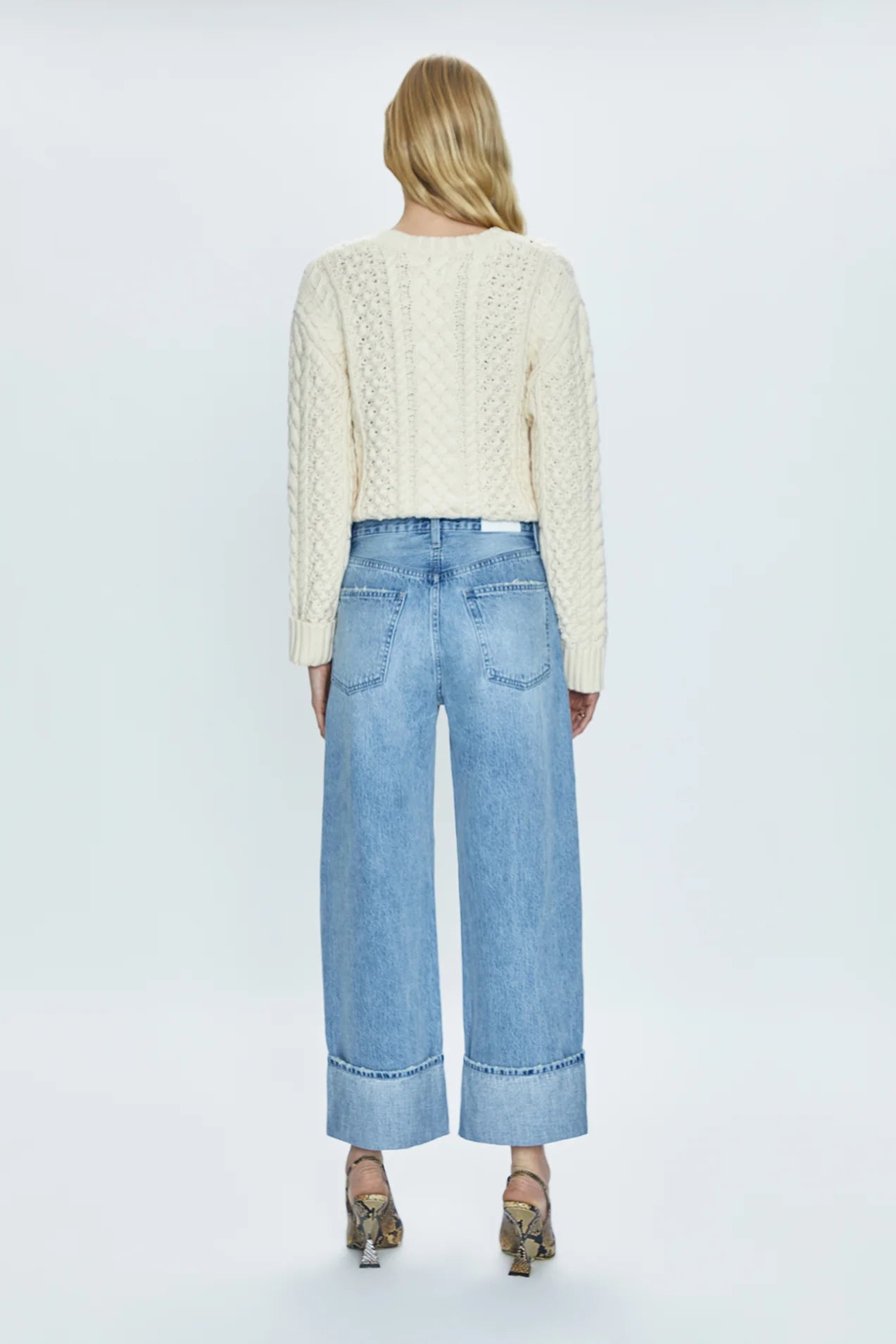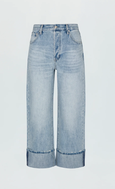 High rise waist with a relaxed, straight leg fit and an oversized cuffed ankle hem. Crafted from rigid, lightweight denim without stretch for an expert fit that holds its shape. Essex is a light blue denim wash with vintage fading and whiskering.